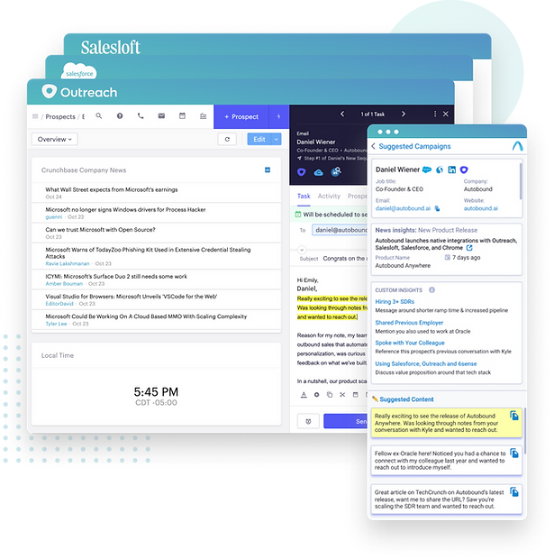 Autobound is another startup totally focused on sales emails, so its problem domain is personalization at scale (--the genre is fixed). The product pulls third party sources for company news and prospect biographics and feeds this, as well as CRM data, into the underlying NLG model. Various cold email drafts are output and provided to the salesperson with in a sidebar within their sales system of engagement (e.g. Salesloft or Outreach).